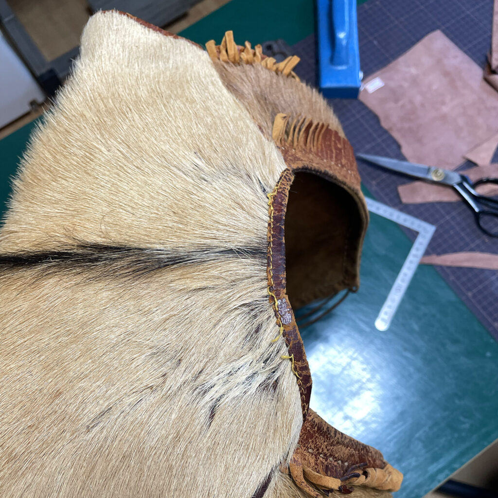 内側の首周りに当て革を切り出し取り付け、全体整えて完成。